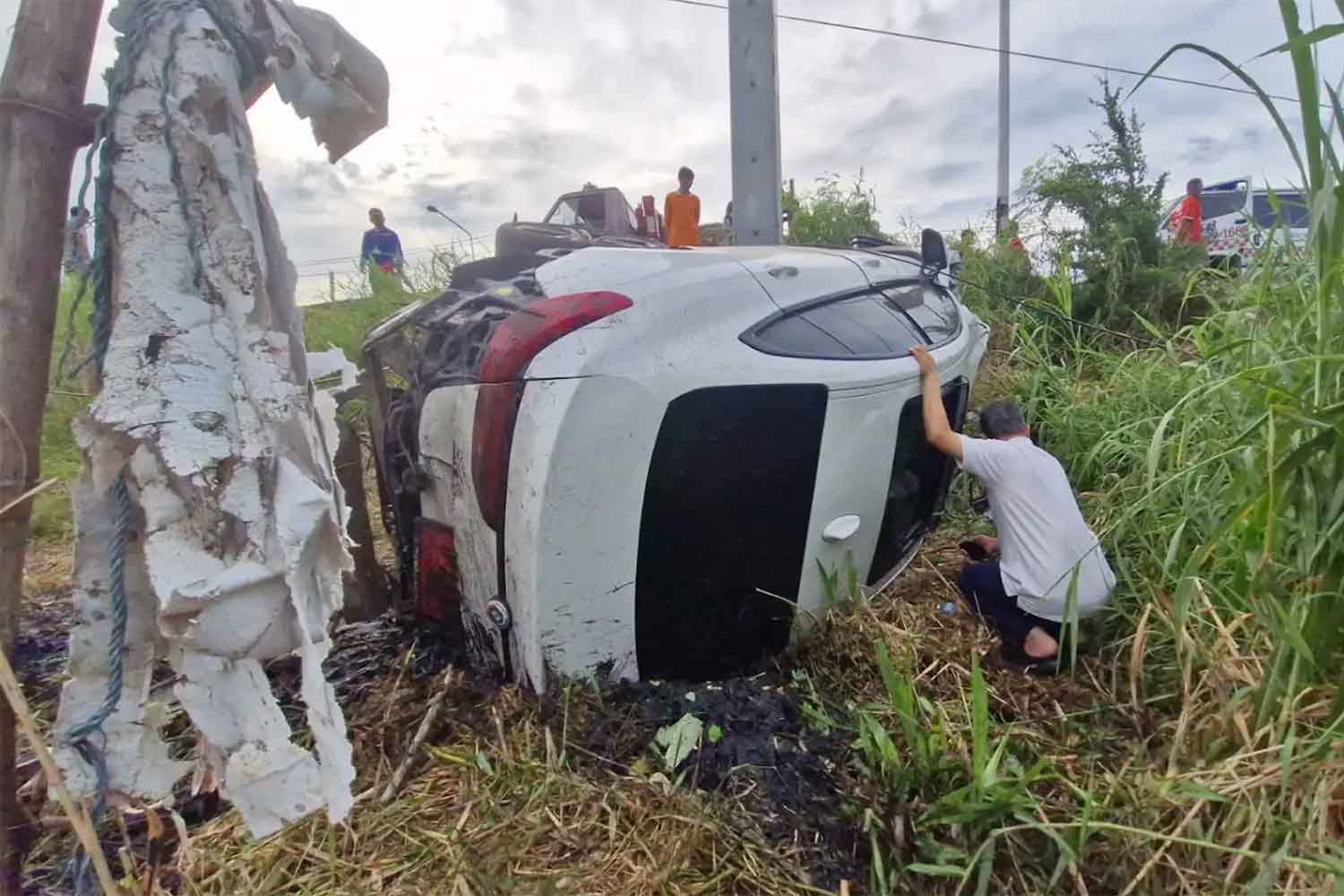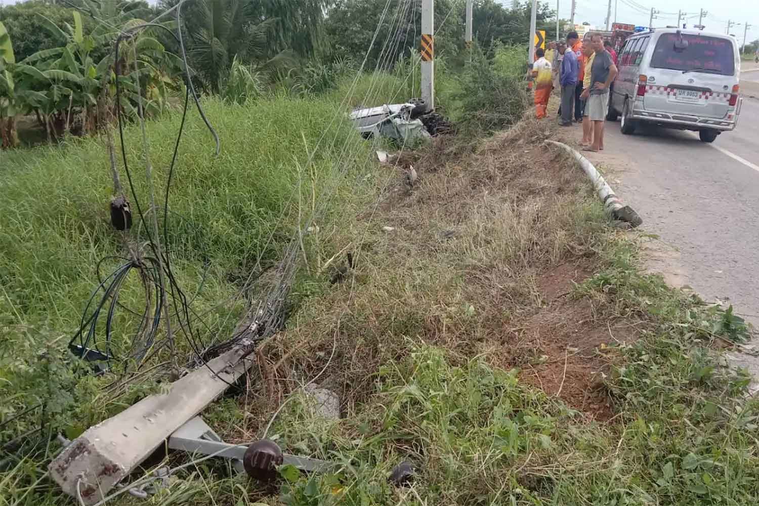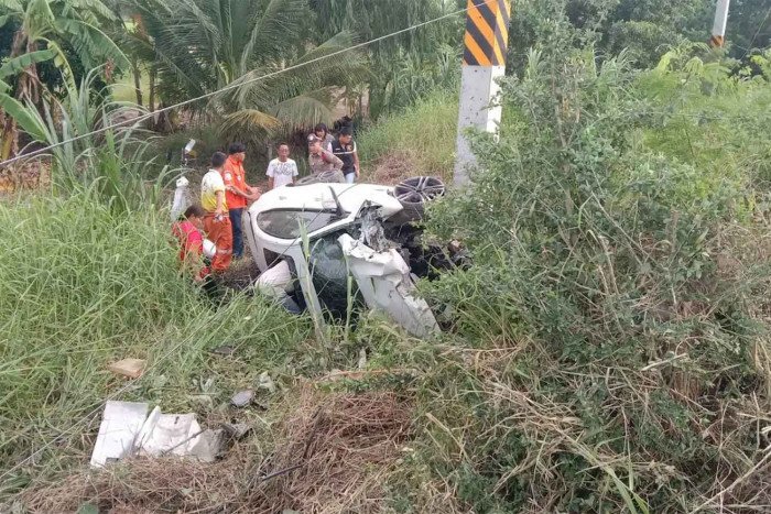 A woman driver named Orakan Petsamrit survived unscathed after her new BMW hit a power pole in Phimai district, Nakhon Ratchasima, on Monday morning. The crash was captured on CCTV and shows the car veering off the road and hitting the pole. She was not injured but was shocked and taken to Phimai Hospital.